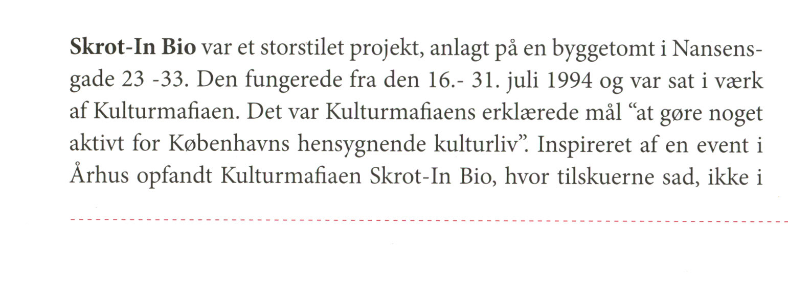Skrot in Bio - drive-in bio for de billøse i Nansesgade i København den 16-31 juli 1994.